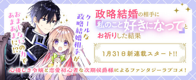 キルタイムコミュニケーション(東京都中央区)は、WEBコミックレーベル「コミックブリーゼ」にて、『政略結婚の相手に「私のこと好きになって」とお祈りした結果』の新連載をスタートいたしました。