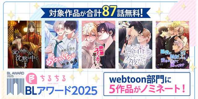 「BLアワード」(商業BLレビューサイト・ちるちる主催)とは、BLの最高峰の作品をファン投票により決定する最大級の商業BLランキング企画です。『webtoon部門』(※2024年1月1日~同年12月31日までに日本語版の最新話が更新された作品が対象)のノミネート作品が本日18時に発表され、comicoからは、昨年、初開催となった同部門において第3位を獲得した『変態ストーカーに狙われてます』(作:みん未)を始め、『愛も憎しみも沈黙の中で』(作:QiangTang, Baili Junxi, The Shubl Website)、『運命の番じゃないなら今夜だけ』(作:綾瀬まの)、『脇役に憑依したら愛されすぎて困ってます』(作:mongdo, Unicorn)、『三津原主任はめちゃくちゃにされたい』(作:たたたん)の計5作のオリジナル作品が選出されました。