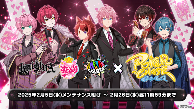 株式会社Skyfall(東京都港区 代表取締役社長:長谷川 智一、以下Skyfall)が運営するバトロワ式オンラインポーカーゲーム『ポーカーチェイス』は、2.5次元歌い手アイドルグループ「すとぷり」「Knight A - 騎士A -」「AMPTAKxCOLORS」「めておら - Meteorites -」から選出された6名の「STPR Creators」と、2025年2月5日(水) ~ 2月26日(水)の期間限定でコラボイベントを初めて開催することが決定しました。