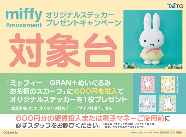 株式会社タイトー(本社:東京都新宿区)は、2月8日(土)より全国のアミューズメント施設にて『ミッフィー オリジナルステッカープレゼントキャンペーン』を開催いたします。