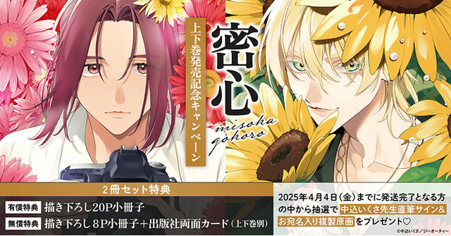 ホーリンラブブックスでは、中込いくさ先生最新コミックス『密心』上下巻発売を記念して豪華キャンペーンを実施いたします!