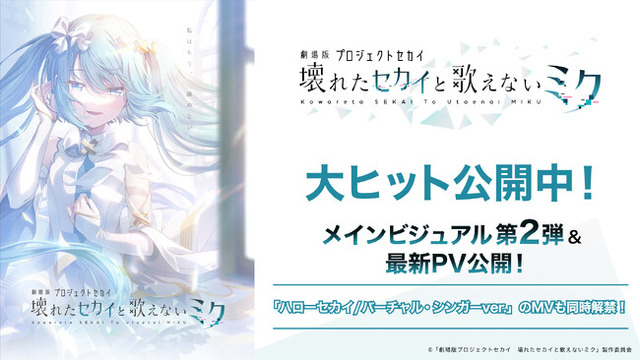 株式会社セガ(本社:東京都品川区、代表取締役 社長執行役員COO:内海州史)と株式会社Colorful Palette(本社:東京都渋谷区、代表取締役社長:近藤裕一郎)は、iOS/Android向けリズム&アドベンチャー『プロジェクトセカイ カラフルステージ! feat. 初音ミク(以下、プロジェクトセカイ)』初となるアニメ映画『劇場版プロジェクトセカイ 壊れたセカイと歌えないミク』について、新たに公開された「開かれた窓のセカイの初音ミク」の姿が描かれたメインビジュアル第2弾を公開したことをお知らせいたします。そのほかにも、「開かれた窓のセカイの初音ミク」が登場する最新PVや、劇場版書き下ろし楽曲「ハローセカイ / バーチャル・シンガーver.」(作詞・作曲:DECO*27、編曲:tepe)のFull ver.MVの解禁など、多数の新情報を公開いたしました。