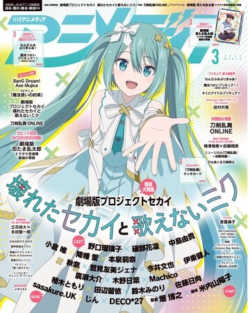 アニメディア3月号のカバー(表紙)は『劇場版プロジェクトセカイ 壊れたセカイと歌えないミク』。開かれた窓のセカイの初音ミクの描きおろしイラストが目印。裏表紙には『刀剣乱舞ONLINE』より、歌仙兼定、陸奥守吉行、山姥切国広、蜂須賀虎徹、山姥切長義が登場。