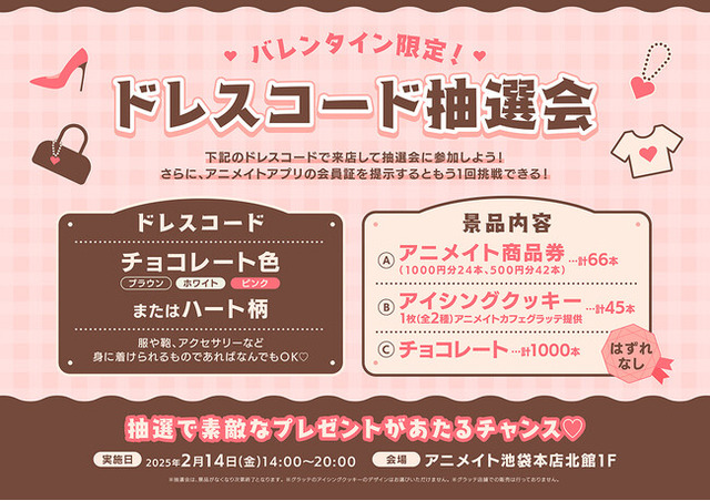 開催内容:ドレスコードに沿った装いでご来店いただいた方は、どなたでも抽選会にご参加いただけます。服や鞄、アクセサリーなど、身に着けているものの中に【チョコレート色(ブラウン/ホワイト/ピンク)】または【ハート柄】のものがあれば対象です。さらに、アニメイトアプリ会員証のご提示でもう1回挑戦することができます。