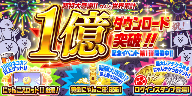 下記期間中、ネコカン600個に加え、専用のレアガチャ「1億DL記念ガチャ」で使える「1億DL記念チケット」がセットで登場!