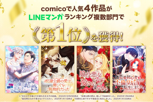 NHN comico株式会社が運営する漫画アプリ「comico」(iOS/Android/WEB版)のオリジナルWEBTOON『灰かぶり令嬢と行き遅れ元王太子の結婚』が2024年12月28日にLINE Digital Frontier株式会社が運営する「LINEマンガ」で配信が開始され、配信翌日に「総合ランキング」を始めとする計10部門で1位を獲得。また、2025年1月5日に配信の『奴隷公爵の愛は、優しくて執拗的だった』、1月10日配信の『脇役悪女なので愛さないでください』、1月12日配信の『恋愛初心者ですが不倫皇后に転生しました』の3作品もLINEマンガにおいて「総合ランキング」など計8部門で1位を獲得と、昨年末から年明けにかけて配信されたcomicoのオリジナルWEBTOONがLINEマンガのランキングで軒並み好ランクを記録しましたのでお知らせいたします。