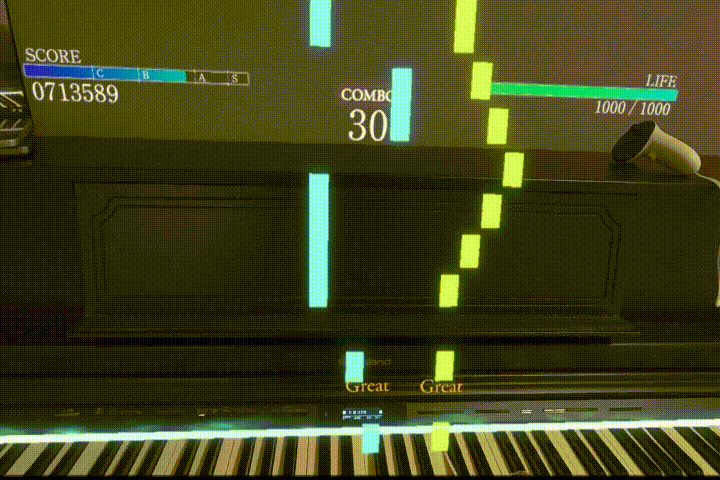 「Sigure」は、VRゴーグルと電子ピアノを繋げて、実際のピアノ上にノーツ(音の棒)を表示する音楽ゲームです。