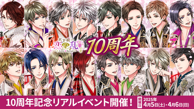 本リアルイベントは、「恋乱LB~華の章~」が昨年12月に配信10周年を迎えたことを記念して開催いたします。10年間の軌跡を辿る展示と、これまでの殿たちとの思い出を振り返る特別な映像の上映を予定しております。チケットは3月1日(土)より発売を予定しておりますので、続報はアプリや公式Xにてお待ちください。