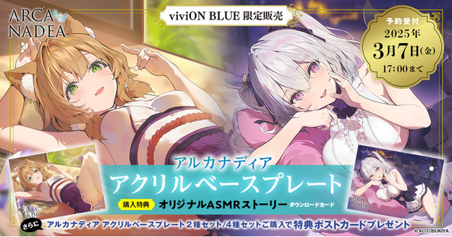 2次元コンテンツとコラボした商品やオリジナルグッズの企画・販売を手掛ける総合バラエティーストア『viviON BLUE』(株式会社viviON、所在地:東京都千代田区、代表:明石耕作)は、ホビーメーカーの株式会社壽屋(本社:東京都立川市、代表取締役社長:清水一行、以下、コトブキヤ)が手がける「SF×ファンタジー」を題材としたプラモデルシリーズ『アルカナディア』とコラボレーションし、特典ASMR付きの限定グッズを販売いたします。