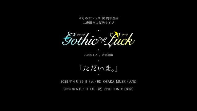 Gothic×Luck は2019年にデビューし、その幻想的な音楽と透明感あふれる歌声で多くのファンを魅了。2022年5月に惜しまれつつも幕を閉じたGothic×Luckが、「けものフレンズ10周年企画」の一環として、今回は特別な形での再結成が実現する。新たなメンバーとして吉宮瑠織を迎え、八木ましろと共に新生Gothic×Luckとして二夜限りの特別なステージをお届け。