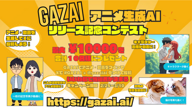 株式会社GAZAI(本社:東京都渋谷区、代表取締役:一岡亮大、以下「当社」)は、生成AIプラットフォーム「GAZAI」(https://gazai.ai/)にて、2月25日(火)12時~3月10日(月)23時59分迄、アニメ生成AI機能の新規リリースを記念して、アニメ・動画投稿コンテストを実施致します。