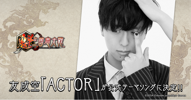 double jump.tokyo株式会社(本社:東京都新宿区、代表取締役:上野広伸・松谷幸紀、以下「double jump.tokyo」)は、当社が開発中の軍勢カードバトルゲーム『魁 三国志大戦 -Battle of Three Kingdoms-』(以降、『魁 三国志大戦』 )の公式テーマソングに、友成空 楽曲「ACTOR」が決定したことをお知らせいたします。