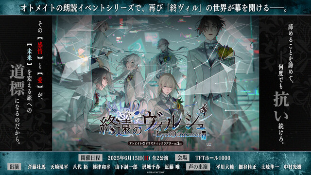 アイディアファクトリー株式会社(代表取締役社長:佐藤 嘉晃/所在地:東京都豊島区)の女性向けゲームブランド「オトメイト」は、朗読イベントシリーズ[オトメイトドラマティックシアター]に再び「終遠のヴィルシュ」をラインナップし、2025年6月15日(日)にイベント開催することを発表しました。