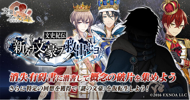 合同会社EXNOA(本社:東京都港区、CEO:村中 悠介、URL:https://games.dmm.com/)が運営するDMM GAMESは、2月25日(火)より、女性向け文豪転生シミュレーションゲーム「文豪とアルケミスト」において、イベント『文史紀伝「新タナ文豪ヲ救出セヨ」』と限定召装『新タナ文豪ヲ救出セヨ』を開始いたしました。