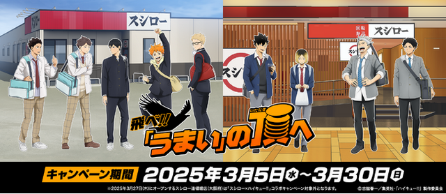 株式会社あきんどスシロー(本社:大阪府吹田市、代表取締役社長:新居 耕平)は、10周年を迎えた人気アニメ「ハイキュー!!」(以下「ハイキュー!!」)と2回目となるコラボを、3月5日(水)より全国のスシローで実施いたします。