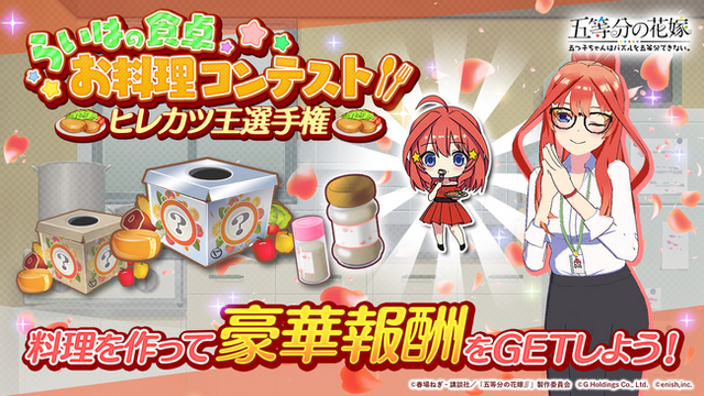 株式会社enish(本社:東京都港区、代表取締役社長:安徳 孝平、以下enish)は、2025年3月1日(土)より、アニメ「五等分の花嫁」初となるゲームアプリ『五等分の花嫁 五つ子ちゃんはパズルを五等分できない。』にて、らいはの食卓お料理コンテスト「ヒレカツ王選手権」を開催いたします。