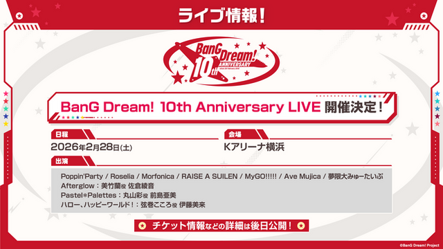 来年2026年2月28日(土)・Kアリーナ横浜にて、バンドリ!の全バンドが出演の公演「BanG Dream! 10th Anniversary LIVE」の開催が決定しました。
