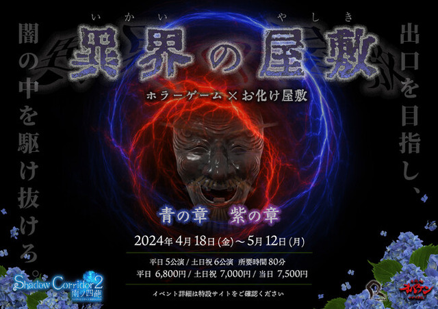 東京都杉並区方南町を拠点とする 株式会社HLC 方南町お化け屋敷オバケン(以下、オバケン)は、2025年4月18日(金)~5月12日(金)まで、東京都港区にある常設お化け屋敷 「凶遡 咽び家(きょうそ むせびや)」 にて、ホラーゲーム 『ShadowCorridor2 雨ノ四葩(あまのよひら)』 とのコラボイベント “異界の屋敷-青の章・紫の章-” を開催いたします。