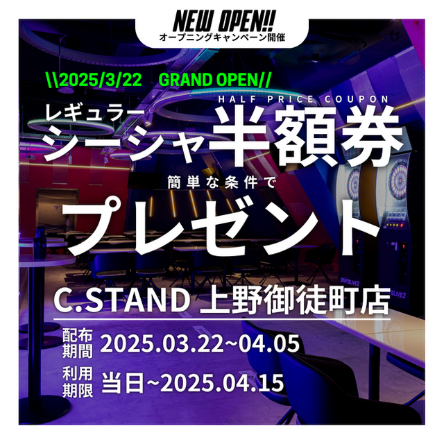 株式会社FS.shakeは、2025年3月22日(土)に「C.STAND 上野御徒町店」をグランドオープンいたしました。シーシャカフェとダーツバーを融合させた新しい形態の店舗で、リラックスとエンタメを同時に楽しめる空間を提供いたします。