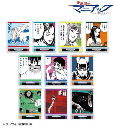 富江シリーズ、双一シリーズ、首吊り気球、押切異談・首幻想、双一の祖父の原作コマをアクリルスタンドに仕上げました。
