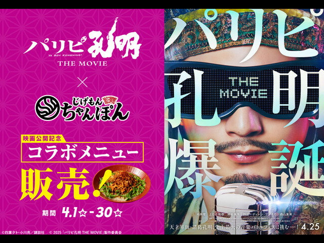 GOSSO株式会社(本社:東京都渋谷区、代表取締役:藤田建、以下 GOSSO)のグループ会社の株式会社大高商事(本社:東京都渋谷区、代表取締役:高階宏一朗、以下 当社)は、『元祖東京濃厚鶏豚骨 じげもんちゃんぽん』(一部店舗を除く)にて、4月25日(金)公開する映画『パリピ孔明 THE MOVIE』とのコラボメニュー4品を、4月1日(火)から4月30日(水)までの期間限定で販売します。また、抽選で映画観賞券やオリジナルグッズが抽選で当たるプレゼントキャンペーンも開催いたします。https://www.jigemonchampon.com