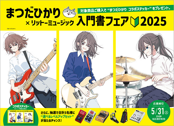 フェア開催店で対象商品を購入された方に「まつだひかりイラスト入りコラボステッカー」を贈呈。さらに 抽選で合計3名様に、「選べるレベルアップセット」をプレゼントします。入学、新学期、新生活の季節、リットーミュージックの入門書で憧れの楽器を始めてみよう!