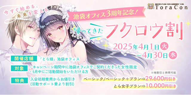 このたび2025年3月に「とら婚 池袋オフィス」がオープンから3周年を迎えたことを記念し、日々の皆様のご愛顧に感謝した記念キャンペーンの開催が決定しました。内容は、過去に実施し好評を得た割引キャンペーン「フクロウ割」の期間限定の復活の他、ウェビナー配信イベント「愛される女性になる方法」や、完全予約制の恋愛相談企画「恋の迷宮脱出相談室」など、特に今回は池袋オフィスでのイベントということもあり、女性層限定の応援企画が盛りだくさんとなっています。