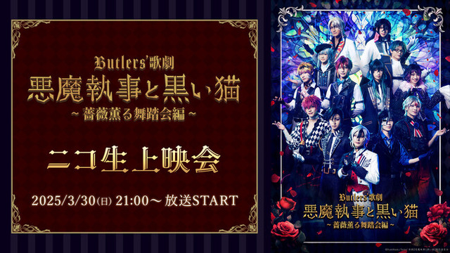 2025年3月30日(日)21時よりButlers’ 歌劇『悪魔執事と黒い猫』~薔薇薫る舞踏会編~の本編映像を、ニコニコ生放送にて配信することが決定いたしました。