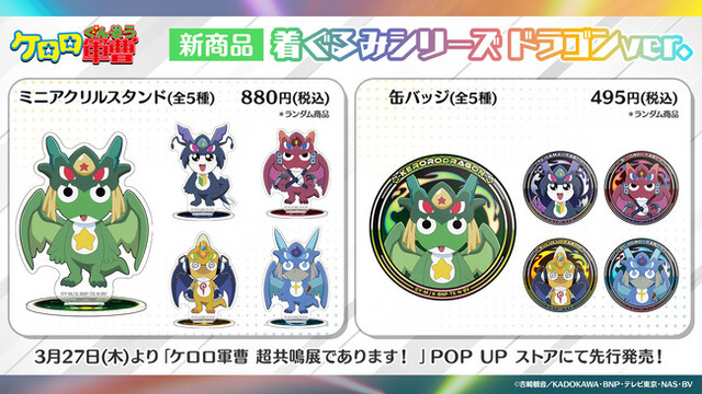 株式会社バンダイナムコピクチャーズ(本社:東京都杉並区、代表取締役社長:佐藤弘幸)は、アニメ『ケロロ軍曹』の新規描き下ろしイラストによる新商品「着ぐるみシリーズ ドラゴンver.」を、3月27日(木)より開催される「ケロロ軍曹 超共鳴(ゲロゲロ)展 であります!」POP UP ストア(大阪府・梅田)にて先行発売いたします。