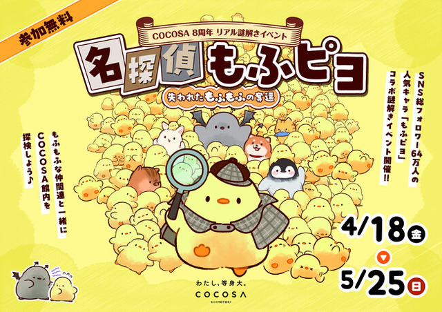 三菱地所プロパティマネジメント株式会社(本社:東京都千代田区・代表取締役 社長執行役員:久保人司)が運営するCOCOSA(所在地:熊本市中央区)は、2025年4月18日(金)から5月25日(日)の期間中、COCOSA 8周年記念リアル謎解きイベントとして、「名探偵もふピヨ 失われたもふもふの奪還」を開催します。SNS総フォロワー64万人の人気キャラ「もふピヨ」が謎解きクリエイターとコラボ。もふもふな仲間達と一緒にCOCOSA館内を探検しながら、謎を解くイベントとなっております。