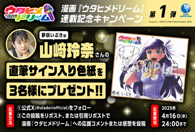 ウタヒメドリーム公式Xアカウントのキャンペーン投稿をリポスト、または引用リポストで応援コメントまたは作品のご感想を投稿した方の中から、3名様に夢咲いぶき役 山崎玲奈さんの直筆サイン入り色紙をプレゼント。