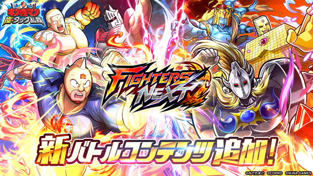 株式会社コプロ(東京都渋谷区 代表取締役:川島孝一郎)は、『キン肉マン 極・タッグ乱舞』で3月27日(木)より新バトルコンテンツ『FIGHTERS NEXT』の開催をお知らせ致します。本機能では複数の編成を使って敵に挑む従来にない新しいイベントとなっております。報酬には超人の育成素材が多数!最強編成で目指せ頂!