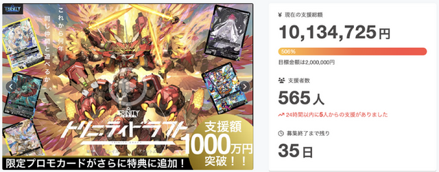京都の太秦で50年以上にわたり染色用粘着テープの卸売業や印刷サービスを展開する株式会社三木盛進堂(代表者:三木幸彦)は、トレーディングカードゲーム(TCG)の要素を取り入れた、新ジャンルのカードゲーム「リミテッドトレーディングカードゲーム(LTCG)」第1弾『トリニティドラフト』のクラウドファンディングを2/26(水) 20:00より実施し、支援額1000万円を突破致しました。このゲームは、現在のトレーディングカードゲームバブルが引き起こす問題を解決するため、全カードセット売りで販売される3人プレイ専用カードゲームです。