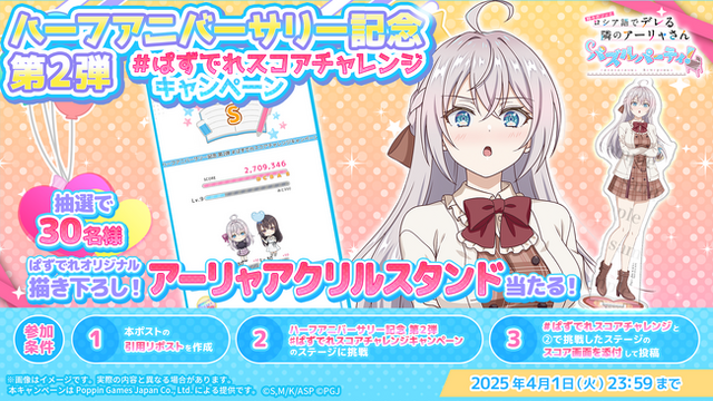 ポッピンゲームズジャパン株式会社(本社:東京都港区、代表取締役 CEO:谷口祐一郎)の開発・運営する、TVアニメ「時々ボソッとロシア語でデレる隣のアーリャさん」初のスマートフォン向けアプリゲーム『時々ボソッとロシア語でデレる隣のアーリャさん パズルパーティ!』(略称:ぱずでれ)では、本日2025年3月26日(水)より、ぱずでれのハーフアニバーサリーを記念し、「ハーフアニバーサリー記念 第2弾 #ぱずでれスコアチャレンジ キャンペーン」を開催します。