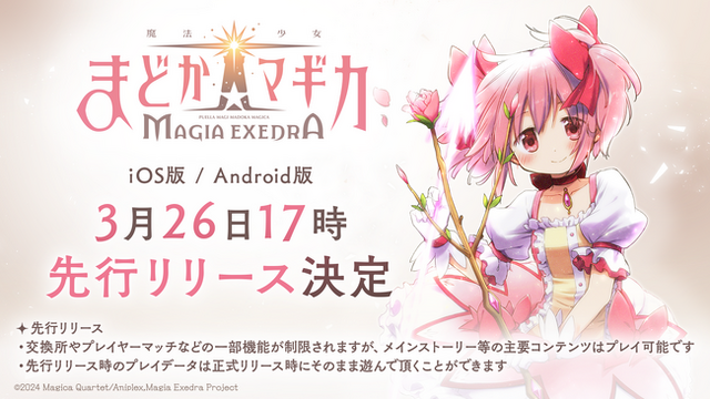株式会社WFS(本社:東京都港区、代表取締役社長:柳原 陽太、グリーホールディングス株式会社100%子会社、以下「WFS」)は、WFSのゲームブランド「ポケラボ」が開発・運営を担当し、株式会社f4samurai(本社:東京都千代田区、代表取締役:金 哲碩、以下「f4samurai」)が共同開発として参加する新作アプリゲーム『魔法少女まどか☆マギカ Magia Exedra』(Magia Exedra:マギアエクセドラ)iOS/Android版が、株式会社アニプレックス(本社:東京都千代田区 代表取締役 岩上敦宏、以下「アニプレックス」)より2025年3月27日(木)からの正式リリースに先がけ、2025年3月26日(水)17時より先行リリースを開始したことをお知らせします。