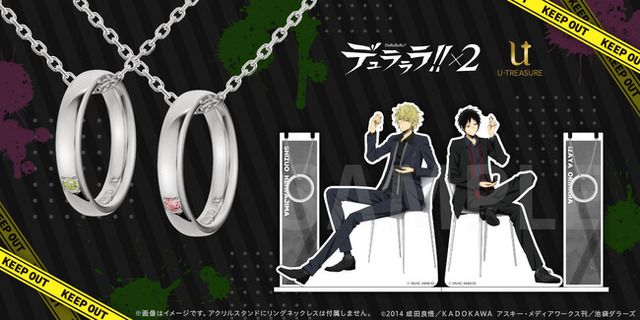 このたびの新作は、TVアニメ「デュラララ!!×2」の折原臨也・平和島静雄をイメージしたリングネックレスと、リングネックレスをディスプレイできる描き下ろしイラストのアクリルジュエリースタンドスタンドです。