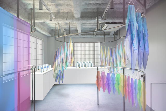 新たにオープンするフロアでは、小松マテーレのグループ会社「アマイケ合同会社」の極薄素材「天女の羽衣(R)」を使用したストールやポケットチーフを多数展示・販売いたします。従来の1階フロアだけでは表現できなかった、素材の美しさを目で見て、触って感じていただける空間となっています。商品の陳列にもこだわり、素材の価値をお客様に伝える新たな展示スペースとして活用してまいります。