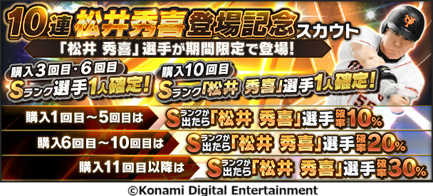 株式会社コナミデジタルエンタテインメントは、モバイルゲーム『プロ野球スピリッツA』(以下、プロスピA)において、4月1日(火)から松井秀喜登場記念スカウトを開始することをお知らせします。
