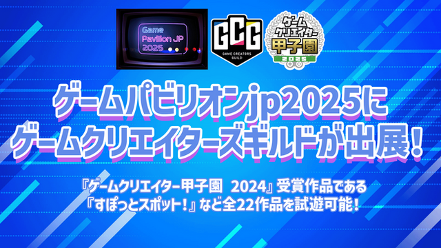 「ゲームパビリオンjp2025」のゲームクリエイターズギルドブース(か 1~3)では、『ゲームクリエイター甲子園 2024』の1001作品の応募作の中から総合大賞を受賞した「すぽっとスポット!」や、U-18総合大賞受賞作品などファイナリストである22作品を展示します。