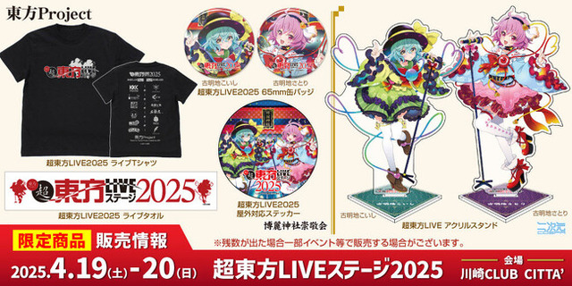 限定販売の「ライブTシャツ」「ライブタオル」をはじめ、『超東方LIVEステージ2025』ビジュアルに描かれた古明地さとり・古明地こいしの「ステッカー」や「缶バッジ」など会場で販売となるグッズ情報を公開しました。