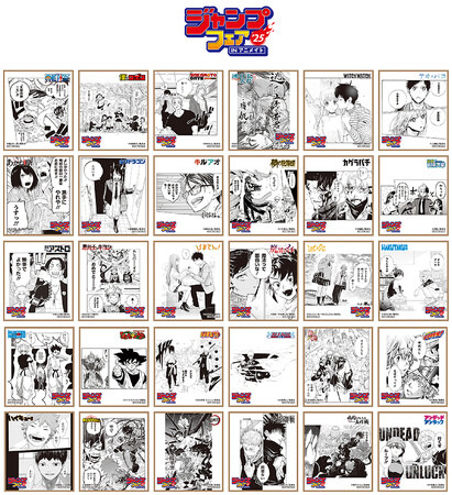 本フェアでは、2025年4月25日から5月11日までの期間中、ジャンプ4誌(週刊少年ジャンプ、ジャンプSQ.、Vジャンプ、最強ジャンプ〈各誌増刊含む〉)・ジャンプコミックス・JUMP j BOOKSをご購入・ご予約(内金500円〈税込〉以上)1冊毎、またはジャンプ原作およびアニメのキャラクターグッズ(関係の商品含む)をご購入・ご予約(内金)500円(税込)毎、あるいはジャンプ原作タイトルのCD・Blu-ray・DVD・ゲームをご購入・ご予約(内金500円〈税込〉以上)1点毎に、ジャンプフェアオリジナル『ミニ色紙』(全30種)を1枚プレゼントいたします。特典には、原作のワンシーンを使用しています。