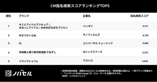 2025年2月1日~2月28日の期間に放送されたテレビCMのうち、高い指名検索スコアを獲得したCM上位5件のランキングと、CM内容をご紹介します。