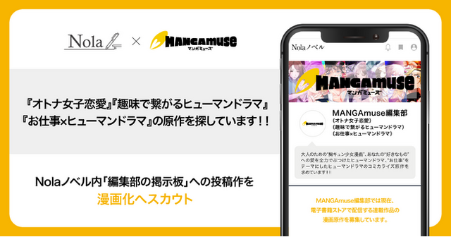 50万人を超える作家の皆さまが登録する創作プラットフォーム「Nola(ノラ)※1」を提供する株式会社indent(本社:東京都千代田区、代表取締役社長:釜形 勇気、以下「indent」)と、株式会社アミューズのグループ企業である株式会社アミューズクリエイティブスタジオ(本社:東京都港区、代表取締役社長:荒木 宏幸、以下「アミューズクリエイティブスタジオ」)は、3月31日(月)より、indentが運営する小説投稿サイト「Nolaノベル」内「編集部の掲示板」に「MANGAmuse編集部」の原作募集ページを開設し、「オトナ女子恋愛」「趣味で繋がるヒューマンドラマ」「お仕事×ヒューマンドラマ」の3ジャンルのスカウトを開始いたしますことをお知らせいたします。