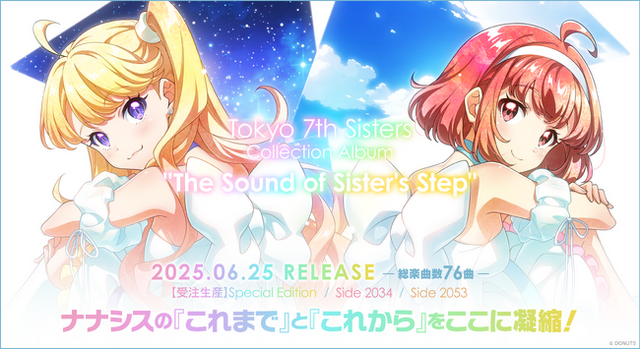 株式会社DONUTS(本社:東京都渋谷区、代表取締役:西村啓成)がApp Store及びGoogle Playにて提供中のスマートフォン向けゲームアプリ「Tokyo 7th シスターズ THE SKY’S THE LIMIT」(略称:ナナシス)は、2025年6月25日(水)にTHREE SEVEN RECORDS初のTokyo 7th シスターズ コレクションアルバム「The Sound of Sister’s Step」のリリースを決定いたしました。また、キャストによるお渡し会も開催いたします。