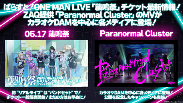 株式会社ClaN Entertainment(本社:東京都港区、代表取締役社長:大井 基行、以下ClaN)は、リアルとバーチャルでパラレルに活動するVTuberプロジェクト「ぱらすと!」初のリアルライブ「ぱらすと! ONE MAN LIVE「襲鳴祭」のチケット一般販売、ZAQ提供「Paranormal Cluster」のカラオケ配信情報、シェアキャンペーンなどの最新情報をお知らせします。