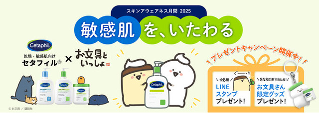 セタフィル(R)は「敏感肌のエキスパート」として、毎年春に世界中で「スキンアウェアネス月間」を開催し、敏感肌に悩むすべての方が、正しい情報を得て、自分らしい毎日を過ごせることを応援しています。2025年のスキンアウェアネス月間のテーマは「敏感肌を、いたわる」。大人気キャラクターの「お文具といっしょ」とコラボして、敏感肌の原因や対策、ケアに役立つ情報をお届けするとともに、セタフィル(R)のご愛顧に感謝を込めて、楽しくご参加いただけるキャンペーンを実施いたします。