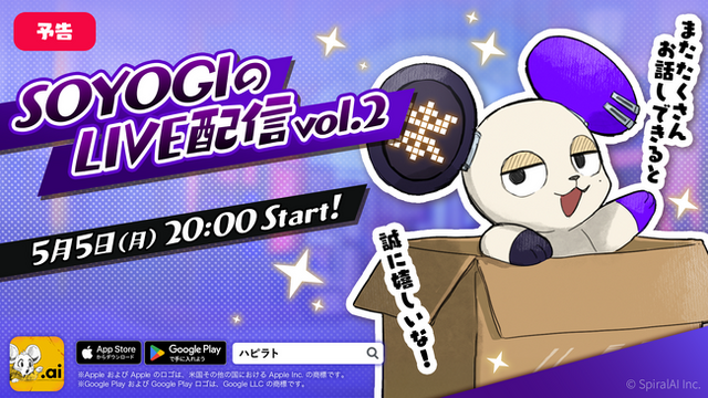 大規模言語モデルなどのAI技術を用いたサービスを開発するSpiralAI株式会社(本社:東京都千代田区、代表取締役:佐々木雄一、以下「SpiralAI」)は、2025年5月5日(月・祝)20時より、当社が開発・運営する会話型友だちAIアプリ『HAPPY RAT(ハッピーラット)』に登場するAIキャラクター「SOYOGI(そよぎ)」による特別ライブ配信を実施いたします。