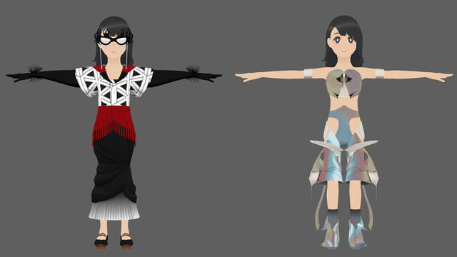 株式会社三越伊勢丹による「デジタルファッションの企画と販売」のコラボレーション企画では、デジタルファッションやファッションを取り巻く社会・環境の変化について全4回の講義を行い、「2040年の未来の新宿のまち」をテーマにデザイン画で授業内コンペティションを実施。大賞に選ばれた2作品のCG衣装をCGworksが3D化 (左:Returns 右:Self-Protection)