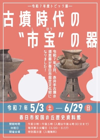 春日市弥生7丁目にある赤井手(あかいで)古墳から出土した須恵器12点が、令和7年3月25日に春日市指定文化財になったことを記念し、展示会を開催します。