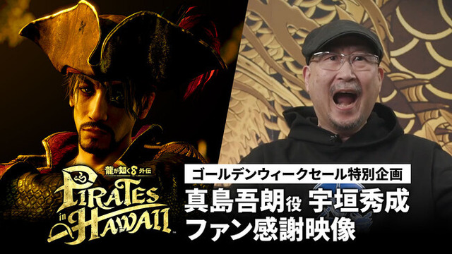 株式会社セガは、発売中の『龍が如く8外伝 Pirates in Hawaii』(以下 『龍が如く8外伝』)について、ゴールデンウィークセールに合わせて「真島吾朗役 宇垣秀成 ファン感謝映像」を、YouTubeチャンネルにて公開しました。